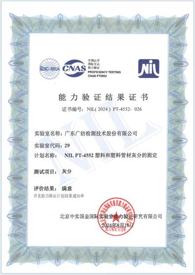 喜報(bào):廣紡檢測(cè)公司收到塑料灰分測(cè)定能力驗(yàn)證結(jié)果滿意證書